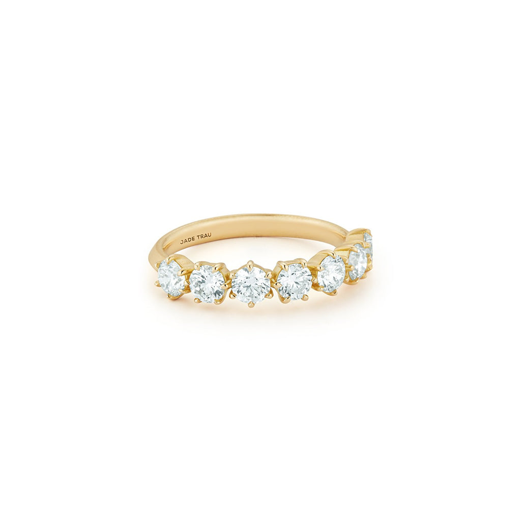 This half version of our Catherine Eternity No.1 features 7 round, brilliant-cut diamonds mounted in a prong-setting halfway around the matte-finish gold band. The half way design allows the ring to sit comfortably on the finger. The back half of the band features our signature knife-edge technique that brings a modern element to the piece. Easy to wear and versatile in design, the Catherine Half Eternity Band will quickly become one of your go-to collection staples.