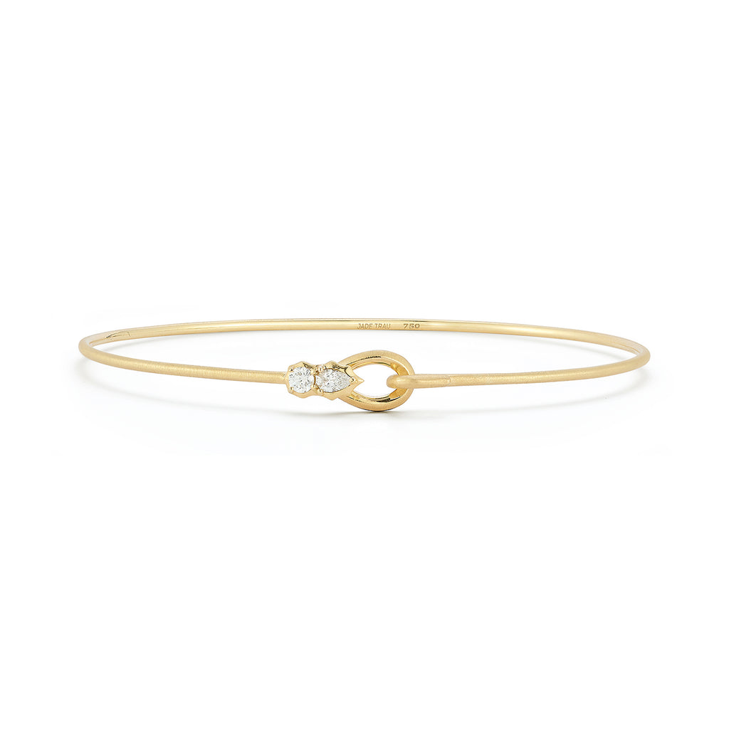 A great starter or building piece to your bracelet stack, the Posey Two Stone Bangle is an easy to wear wire bangle that packs a substantial punch. Handcrafted in 18-karat and featuring 0.13tcw of round and pear shaped diamonds, the Posey Two Stone Bangle is lightweight and goes with anything.