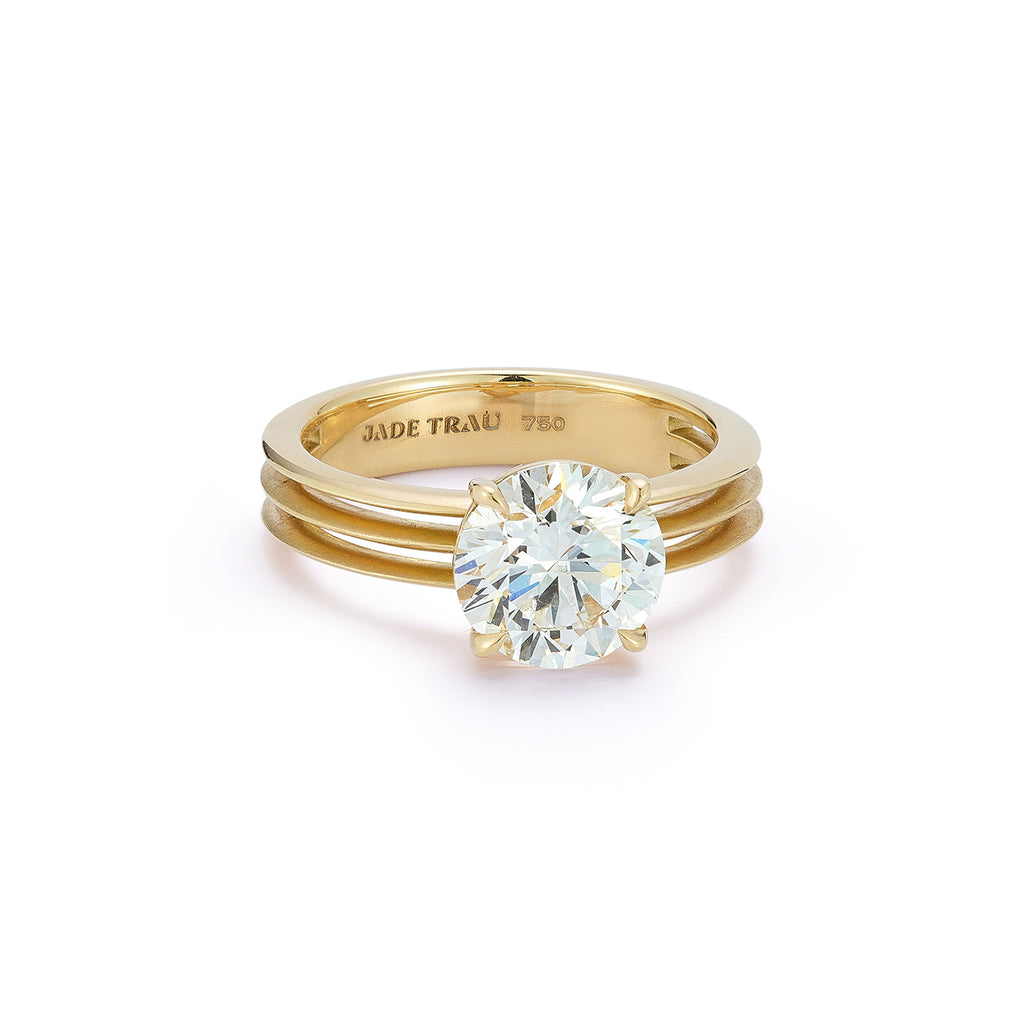 Delicate and feminine, the Jane Ring doesn't lack any edgy coolness. Handcrafted in 18-karat gold and featuring three sleek knife-edge bands that give the perfect amount of negative space. This new take on the classic gold solitaire engagement ring is sure to become your next big crush.