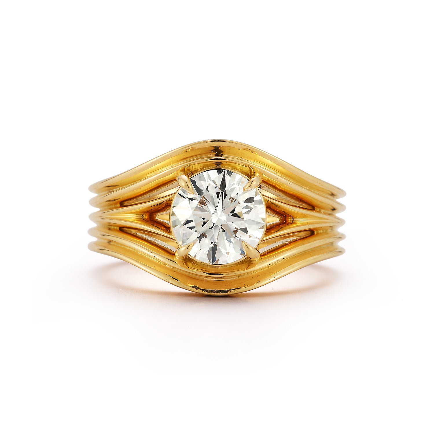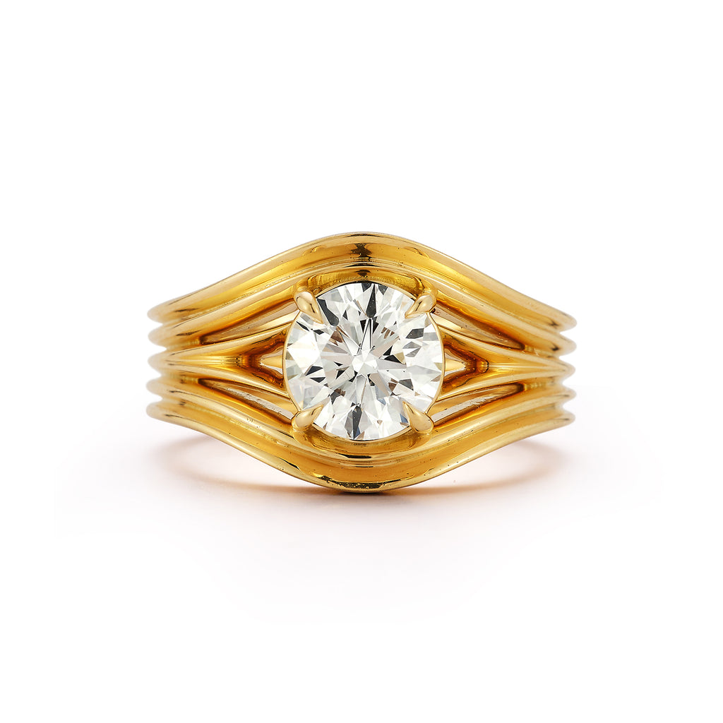 The Cleo Ring is defined by tightly packed knife edges wrapped around a prong-set center stone. The result is an architectural design that puts the diamond fully on display.