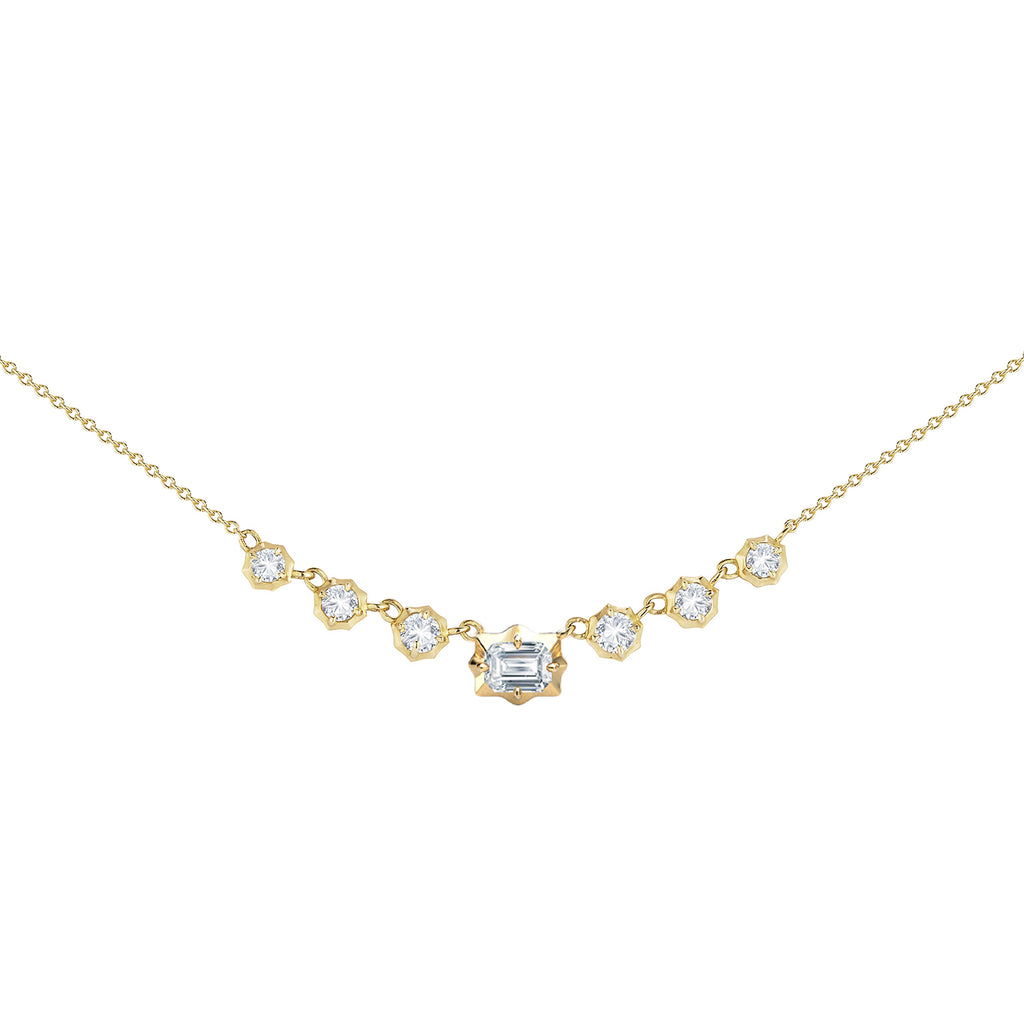 The perfect everyday staple, the Small Vanguard Necklace can be easily worn as a stand alone piece or as a delicate bookend to an edgier neck stack. Handcrafted in 18-Karat gold and featuring a row of 1 emerald-cut and 6 graduating round, brilliant-cut diamonds, the Small Vanguard Necklace gently moves with you and is a timeless addition to any collection.