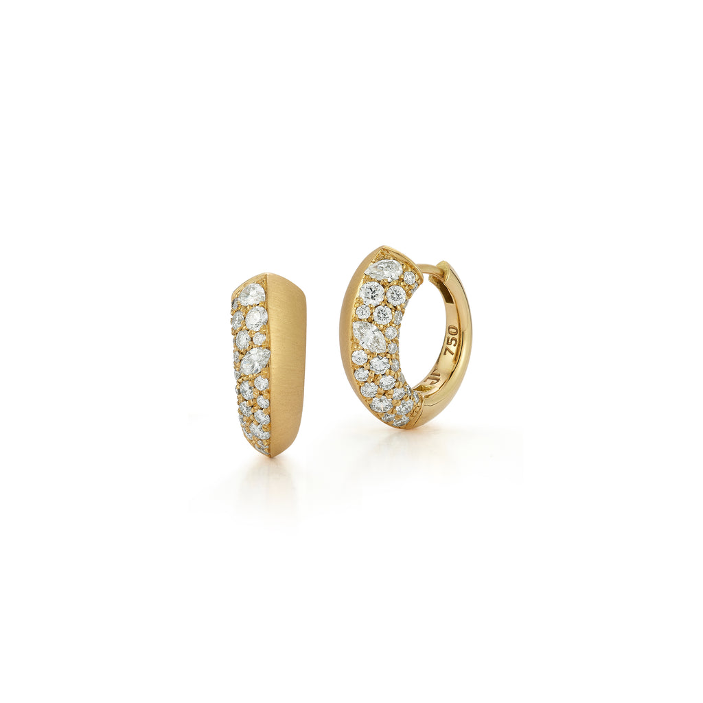 An extension of our signature Frankie silhouette, the Frankie Half Diamond Huggies are handcrafted in 18-karat gold and features 0.63tcw of mixed shaped cobblestone pave using round, pear, and marquise diamonds.
