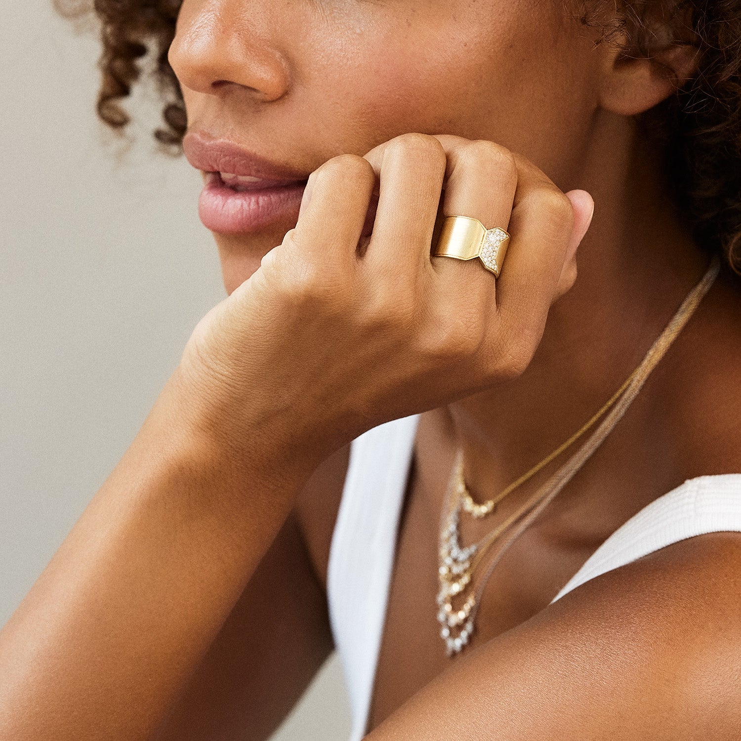A versatile foundation, for him or her, of iconic silhouettes including bands, signet rings and chain bracelets in various shades of matte gold. Wear alone or pair with our diamond collection pieces for a more dynamic statement.