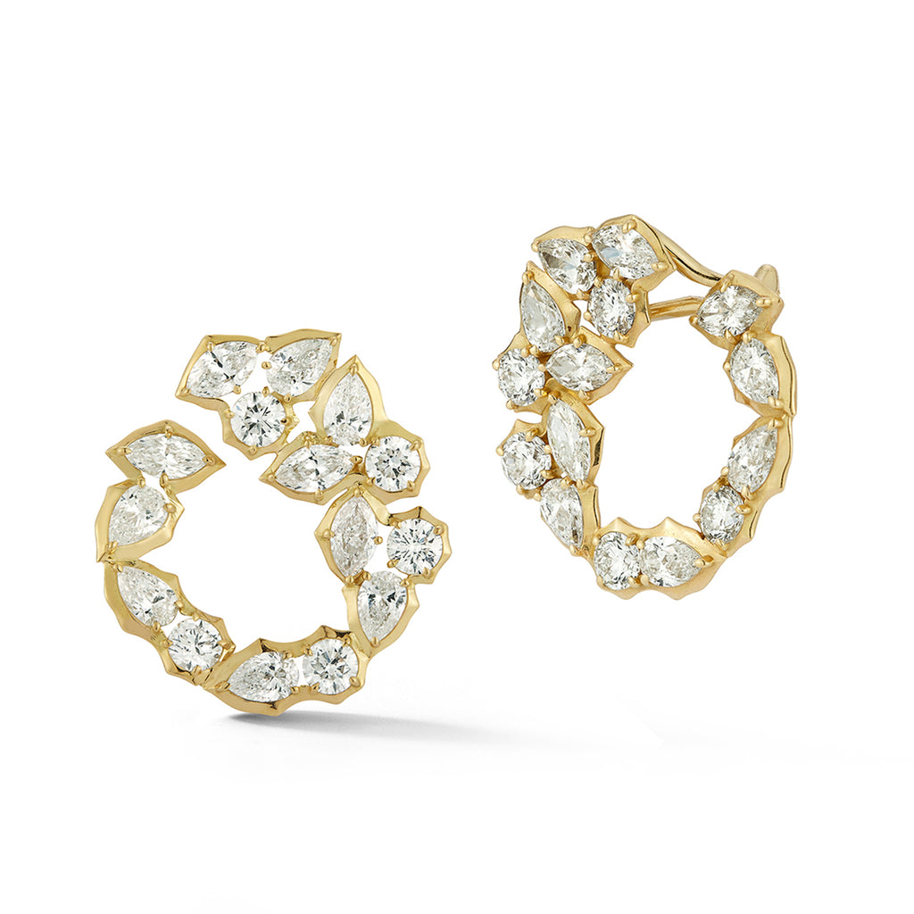 A new iteration of our signature Crescent Hoops, the Poppy Hoops are designed with the four unique diamond motifs that make up the Poppy collection. The lightweight silhouette allows each hoop to wrap slightly around the lobe of the ear giving the piece a dimensional and innovative feel. Handcrafted in 18-karat gold and featuring 5.70tcw of marquise, pear, and round shaped diamond clusters, the Poppy earrings are the perfect occasional piece that add the right amount of glam and sparkle to any look.