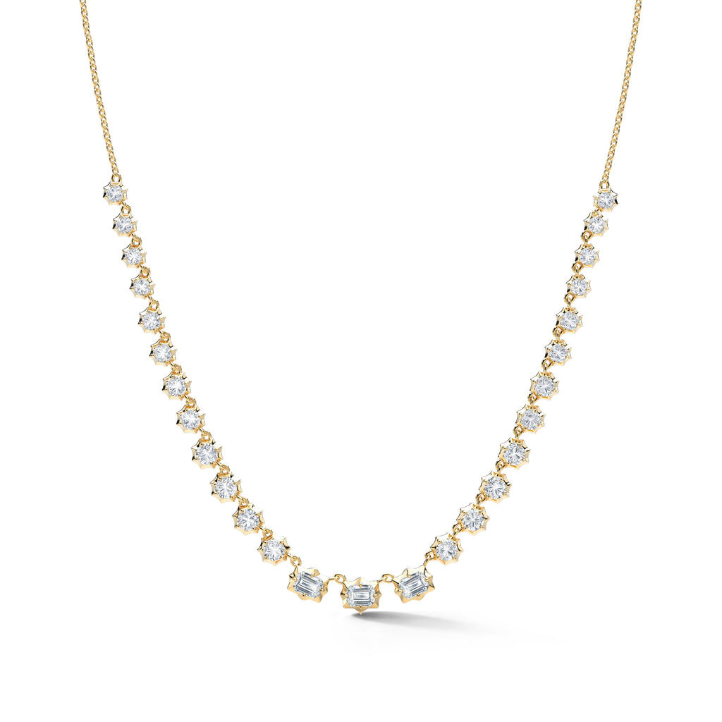 This tennis-style eternity necklace is the perfect hint of classic while firmly rooted in the present. The Vanguard Diamond Riviera Necklace combines the classic tennis silhouette with our signature Alchemy setting to bring forward a modern feel. Handcrafted in 18-karat gold and featuring 3 emerald-cut and 22 round, brilliant cut diamonds, the Vanguard Riviera Necklace is a show-stopping must-have for any jewelry collection.