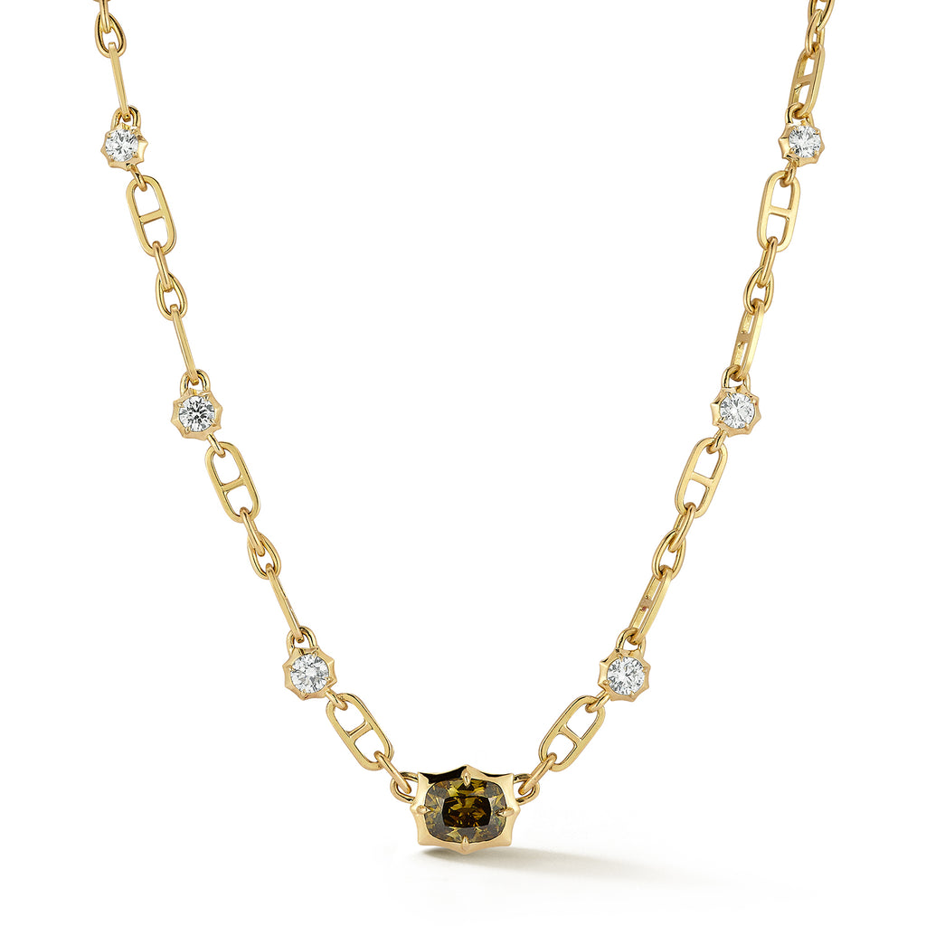 This one-of-a-kind necklace features a rare 2.18-carat chameleon cushion-cut diamond in our iconic alchemy setting. An 18-karat yellow gold small mariner link chain is accented with sophisticate round diamonds, bringing the total carat weight to 3.86. This piece is for those who want distinctive diamond pieces.