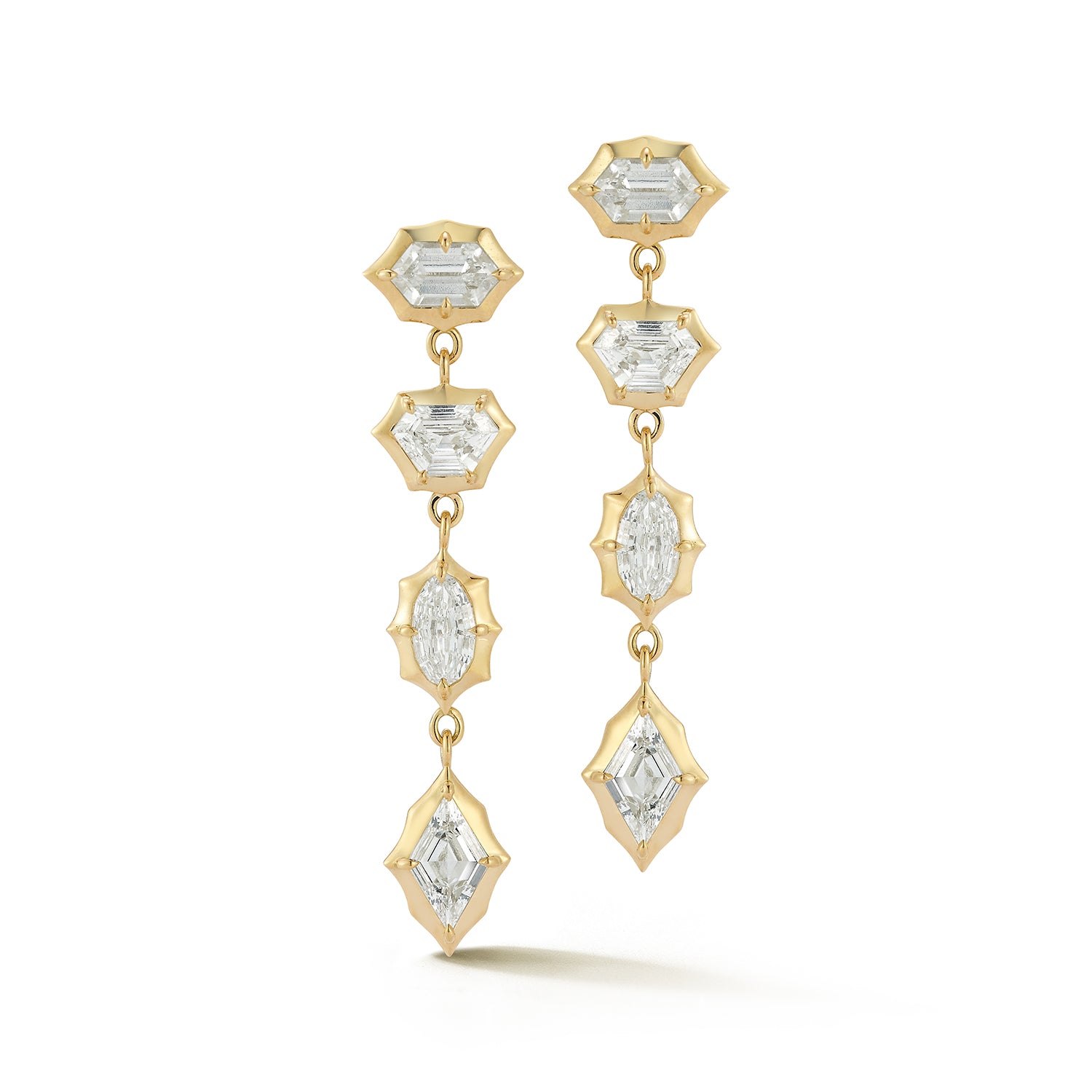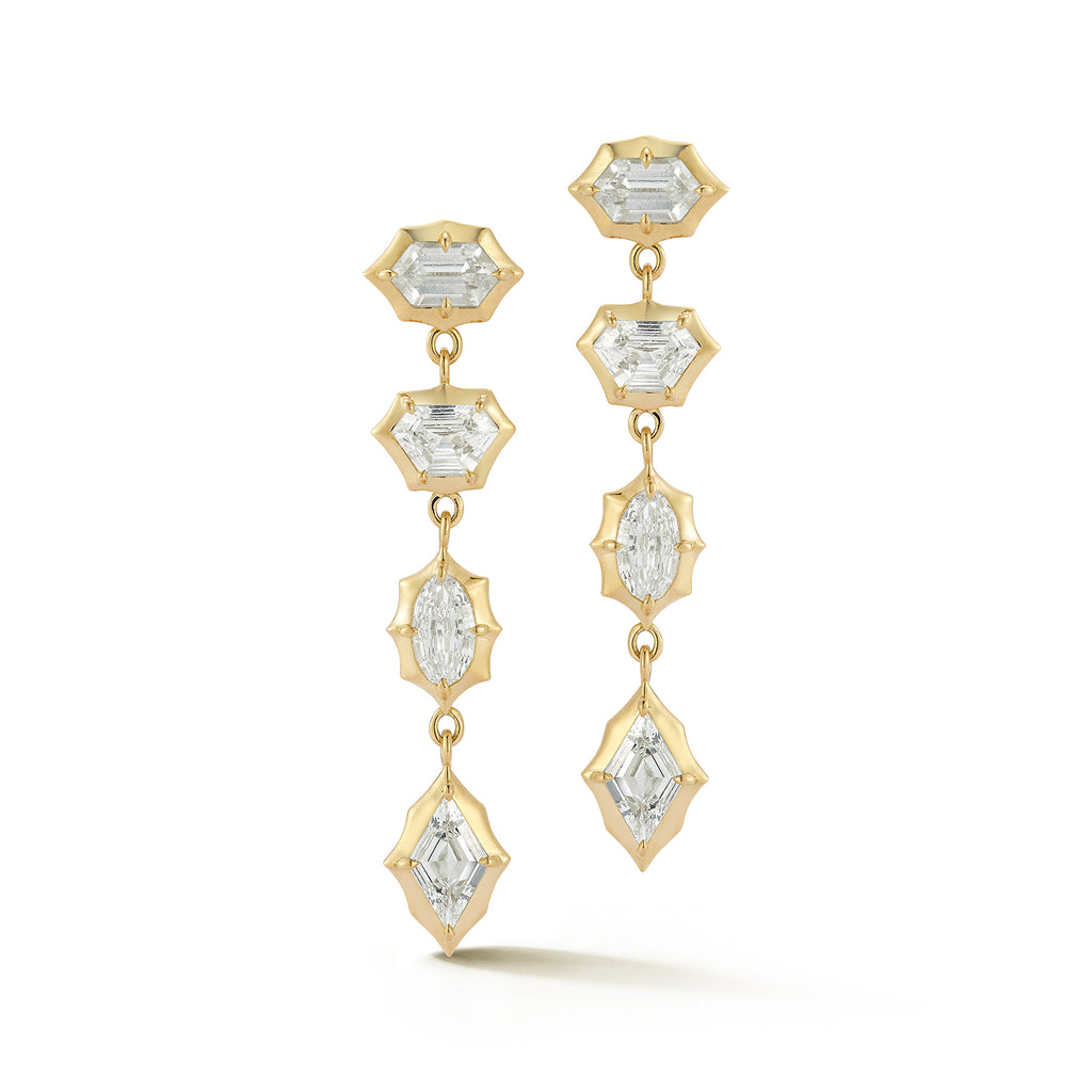 Defined by fluid movement, these one-of-a-kind drop earrings feature a mix of lozenge, oval, shield, and hexagon diamonds totaling 3.42 carats. Crafted in 18-karat gold, they offer an expressive, light-catching presence.