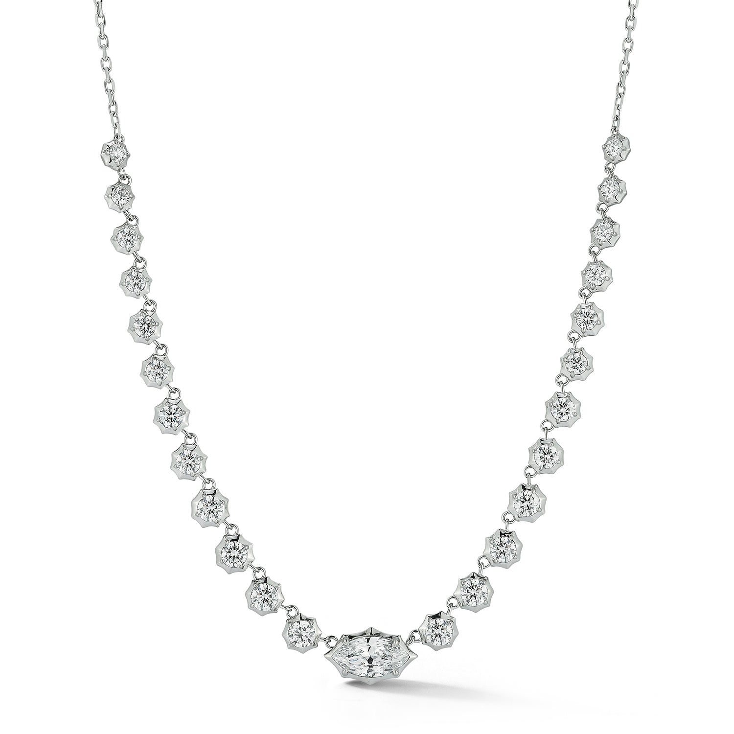 The 18-karat White Gold XL Riviera necklace is defined by a 1.5-carat marquise-cut center stone, framed by a gradient of round diamonds totaling 5.26 carats. An adjustable rectangle chain allows for easy layering, while still looking great on its own.