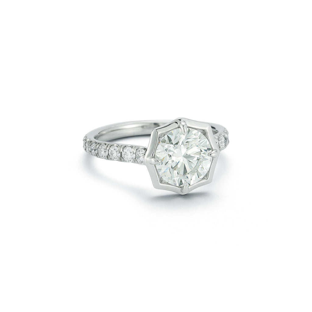 The Pave Alchemy Round Solitaire Ring is our refined interpretation of a classic solitaire engagement ring. Crafted in platinum, the center round diamond is mounted in a prong setting on a pave band and is held securely in an outer octagon layer (inspired by our signature Alchemy-silhouette) to protect the center stone, yet still maintaining the brilliance of it.