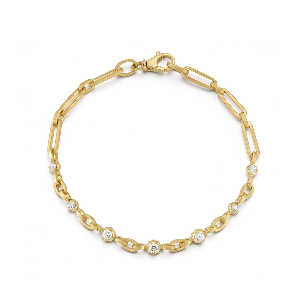 The Pippa Bracelet features a sleek silhouette complimented by alternating diamond and chain links for a modern spin on classic chain bracelet designs. Handcrafted in 18-karat gold and accented by 7 round, brilliant-cut diamonds, the Pippa Chain Bracelet can be easily paired with other stacking bracelets and worn for any occasion.