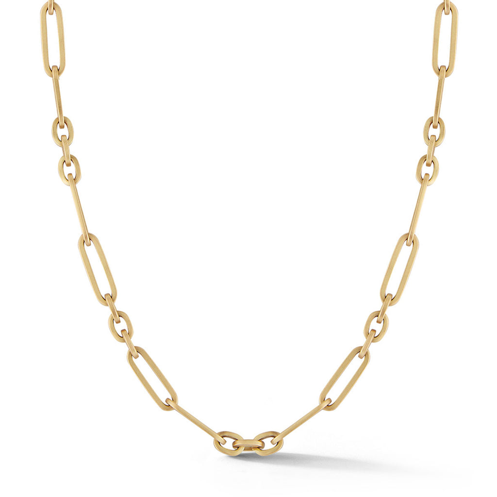 Everyone needs an everyday gold link chain necklace...that's where the Paige comes in. Handcrafted in solid 18-karat gold and featuring alternating shapes and sizes, the Paige Link Chain Necklace is an essential for every jewelry collection. It's thick silhouette and weighty feel provides a chain that seamlessly works with delicate pieces and is easily layered for a casual, cool-girl aesthetic. Combined with our signature matte finish, the Page Chain is an updated homage to great vintage chains of the past.