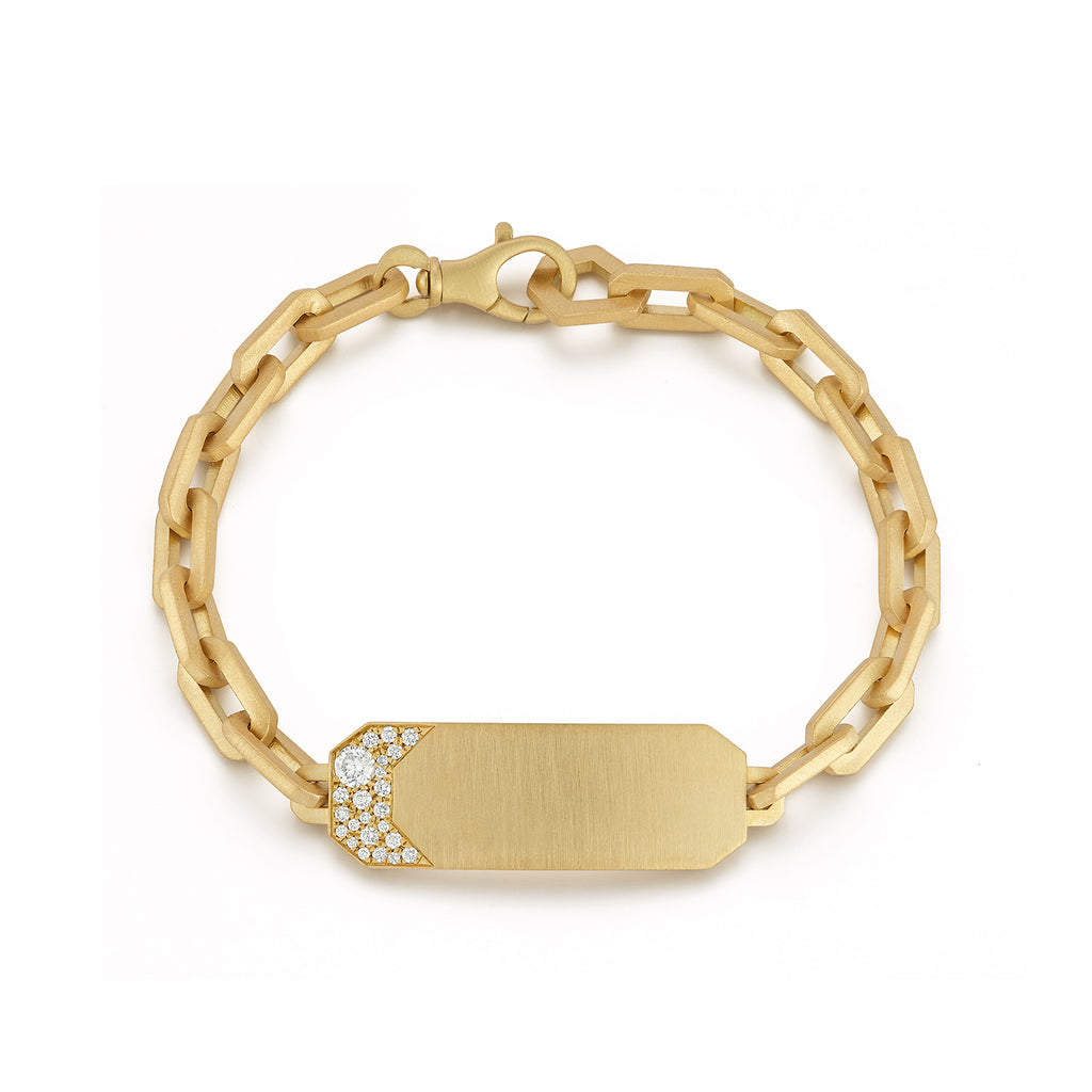 Our bestselling Bracelet features an extra-wide handcrafted 18-Karat gold name bar to allow for more personal customization. Featuring a delicate cluster of pave diamonds, the Billie ID Bracelet's weighty chain provides a luxurious feel that is sure to make this an everyday favorite.