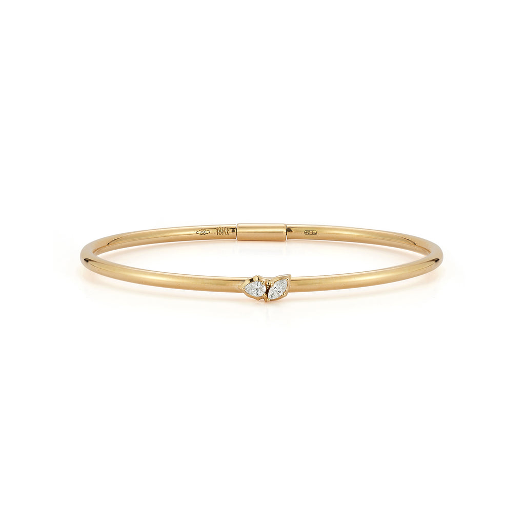 Posey Two Stone Plié Bangle is handcrafted in 18-karat gold and features 0.13tcw of pear and marquise diamonds. A new take on the classic silhouette, its seamless design and easy to wear vibe is luxurious while still feeling extremely everyday.