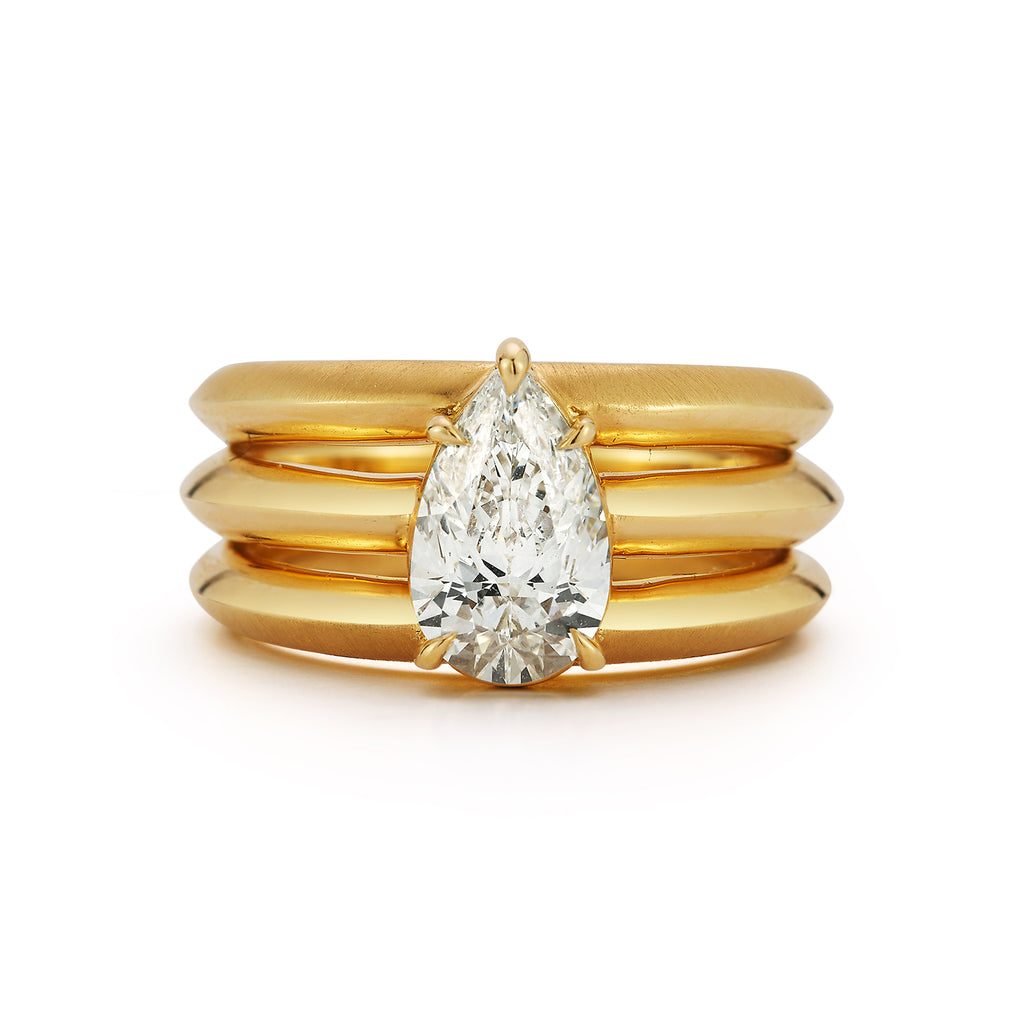 The Triple Frankie Solitaire engagement ring features a band designed to resemble three stacked Frankie rings, topped with a prong-set diamond. A new take on the solitaire, defined by bold proportion and clean lines.