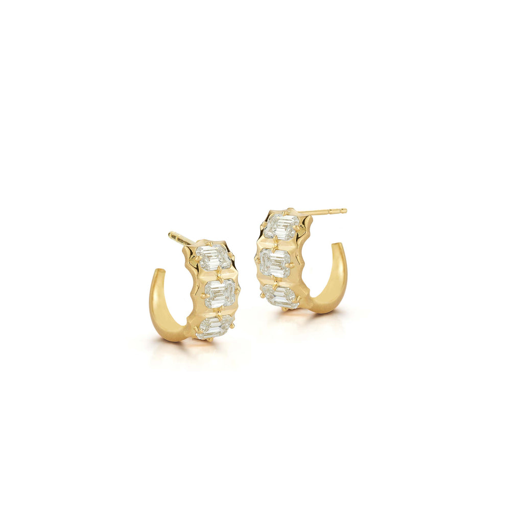 The Vanguard Small Hoops are our take on classic diamond hoops, but for the girls who want those clean modern lines that you can get from a step-cut diamond. Set in our signature Vanguard shield motif, these hoops are equal parts blingy diamond statements and casual gold heavy essentials. Their smaller silhouette and lightweight feel also give them that everyday vibe.